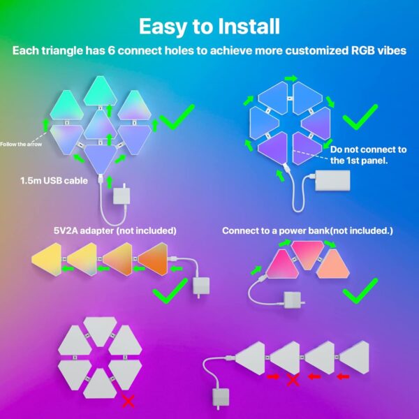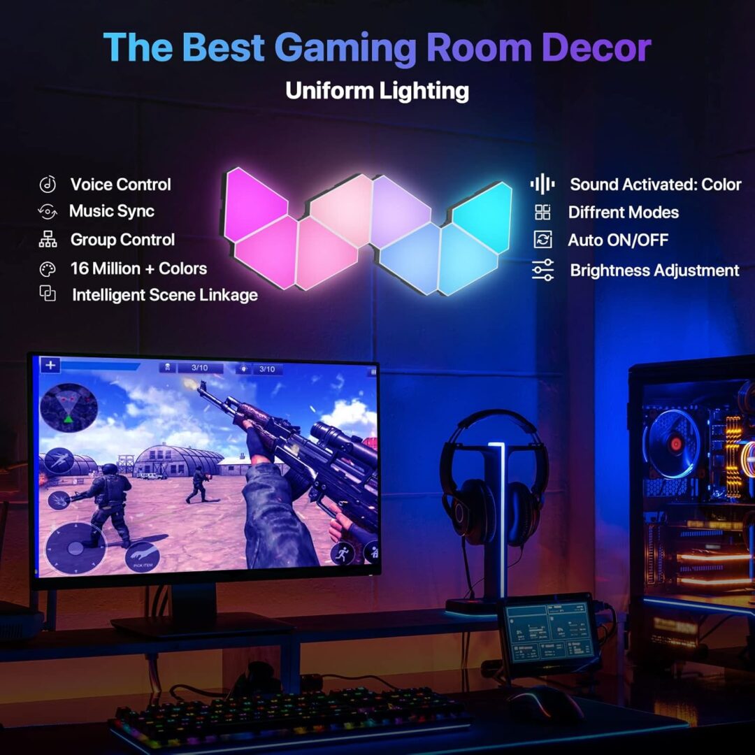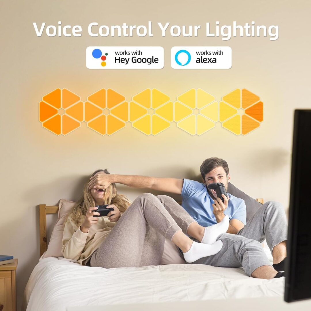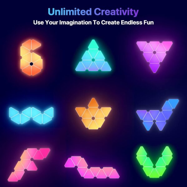 1. DIY Intelligent LED Wall Panel Kit: Design your triangular lighting panel layout or choose from a wide range of recommended designs in the application. Create personalized lighting for your gaming room, living room, bedroom, and more wall decoration scenes.