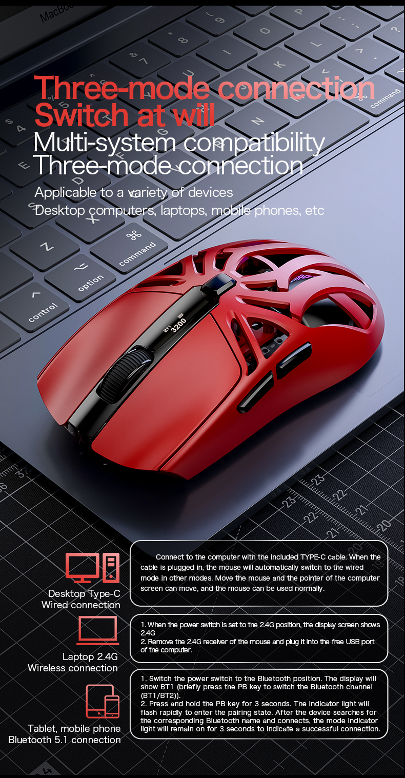 Connection method:2.4G wireless+BT5.1+Type-C wired
