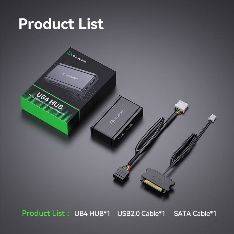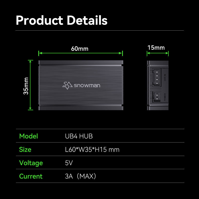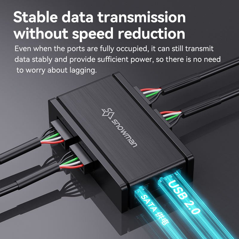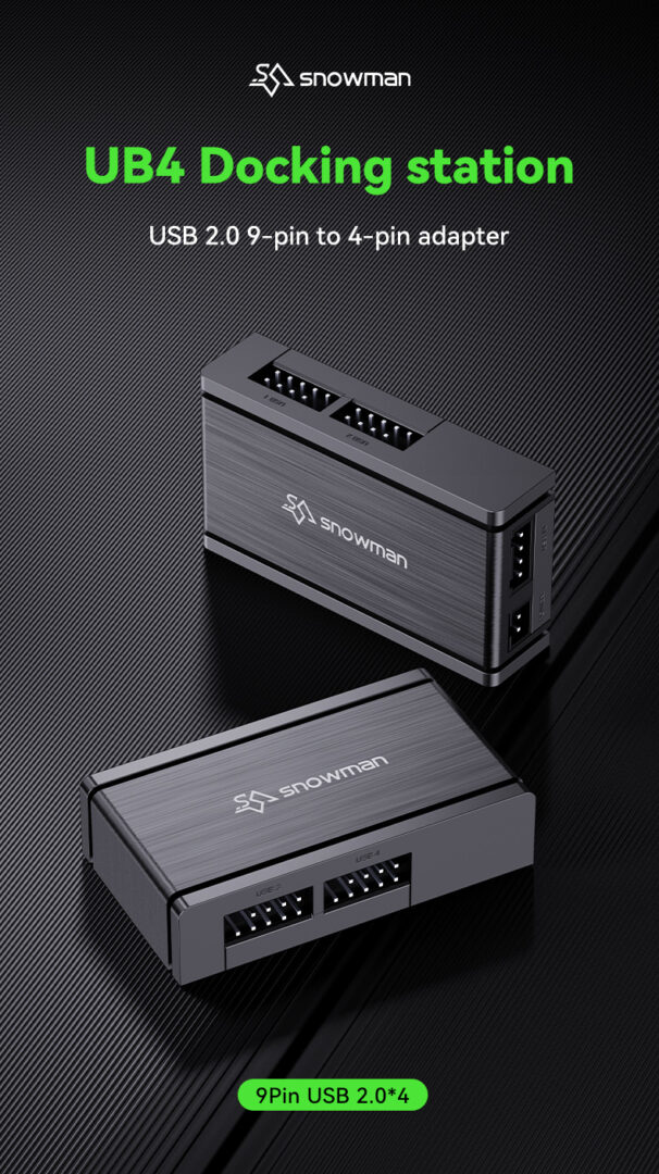 This SNOWMAN USB 4-Port Hub Splitter Adapter is designed for desktop PCs, featuring motherboard 4 x 9-pin USB 2.0 connectors. It is made of ABS material, ensuring durability and a sleek black finish. Certified with EMC, RoHS, CE, and FCC, it guarantees compliance with international safety and environmental standards, offering market access and reliability. The product supports multifunctional use.